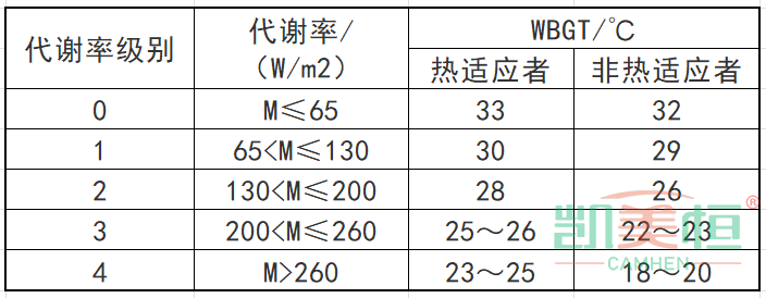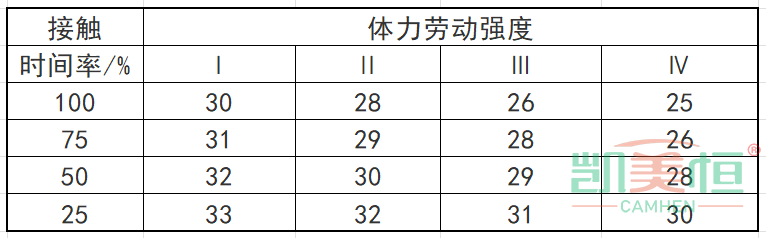 《工作場所有害因素職業接觸限值 第2部分:物理因素》(GBZ2.2—2007)接觸時間率(勞動者在一個工作日內實際接觸高溫作業的累計時間與8h的比率)100%,體力勞動強度為Ⅳ級,WBGT指數限值為25℃;勞動強度分級每下降一級,WBGT指數限值增加1~2℃;接觸時間率每減少25%,WBGT指數限值增加1~2℃,見下表。本地區室外通風設計溫度≥30℃的地區,下表中規定的WBGT數值相應增加1℃。