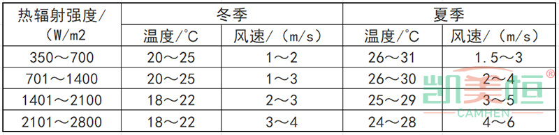 ②當高溫作業時間較長,工作地點的熱環境參數達不到衛生要求時,應采取降溫措施。設置系統式局部送風時,工作地點的溫度和平均風速應符合下表的規定。