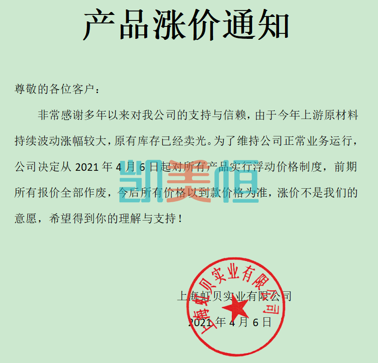 非常感謝多年以來(lái)對(duì)我公司的支持與信賴,由于今年上游原材料持續(xù)波動(dòng)漲幅較大,原有庫(kù)存已經(jīng)賣光。為了維持公司正常業(yè)務(wù)運(yùn)行,公司決定從2021年4月6日起對(duì)所有產(chǎn)品實(shí)行浮動(dòng)價(jià)格制度,前期所有報(bào)價(jià)全部作廢,今后所有價(jià)格以到款價(jià)格為準(zhǔn),漲價(jià)不是我們的意愿,希望得到你的理解與支持!