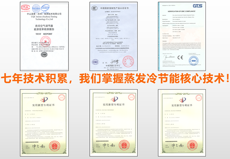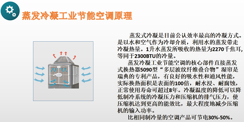 蒸發式冷凝是目前公認效率最高的冷凝方式。是以水和空氣作為冷卻介質,利用水的蒸發帶走冷凝熱量。1升水蒸發所吸收的熱量為2270千焦耳,等同于2300BTU的冷量。蒸發冷凝工業節能空調的核心部件直接蒸發式換熱器5090型“多層波紋纖維疊合物”濕簾是瑞典的專利產品,有良好的吸水性和通風性能,實際換熱面積是表面的100倍,耐水浸、耐腐蝕,正常使用壽命可超過8年。冷凝溫度的降低可以降低制冷系統的冷凝壓力和壓縮機的排氣壓力,使壓縮機達到更高的能效比,最大程度地減少壓縮機的輸入功率。比相同制冷量的空調產品可節電30%-50%