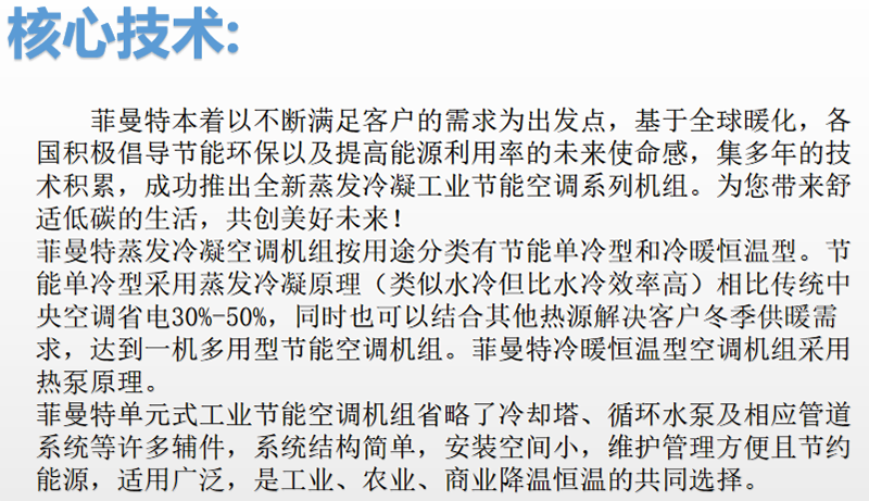 • 產品描述: 工業節能省電空調,經過多年的不斷創新科技,比傳統空調省電30%-50%! 至今已獲三十多項國家專利認證和國家權威機構能效檢測認證!其所建立起來的強大專業研發能力,以其創新性和穩定性,為客 戶場地提供專業的控溫、新風、恒溫解決方案,持續為客戶帶來超越期望的價值。